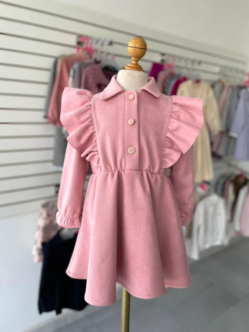 116. Vestido rosa de gamuza con olanes a los lados