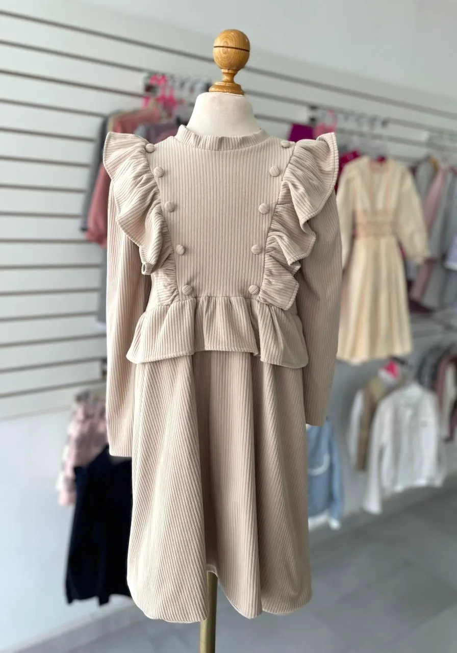 124. Vestido beige con detalle de olanes y botones