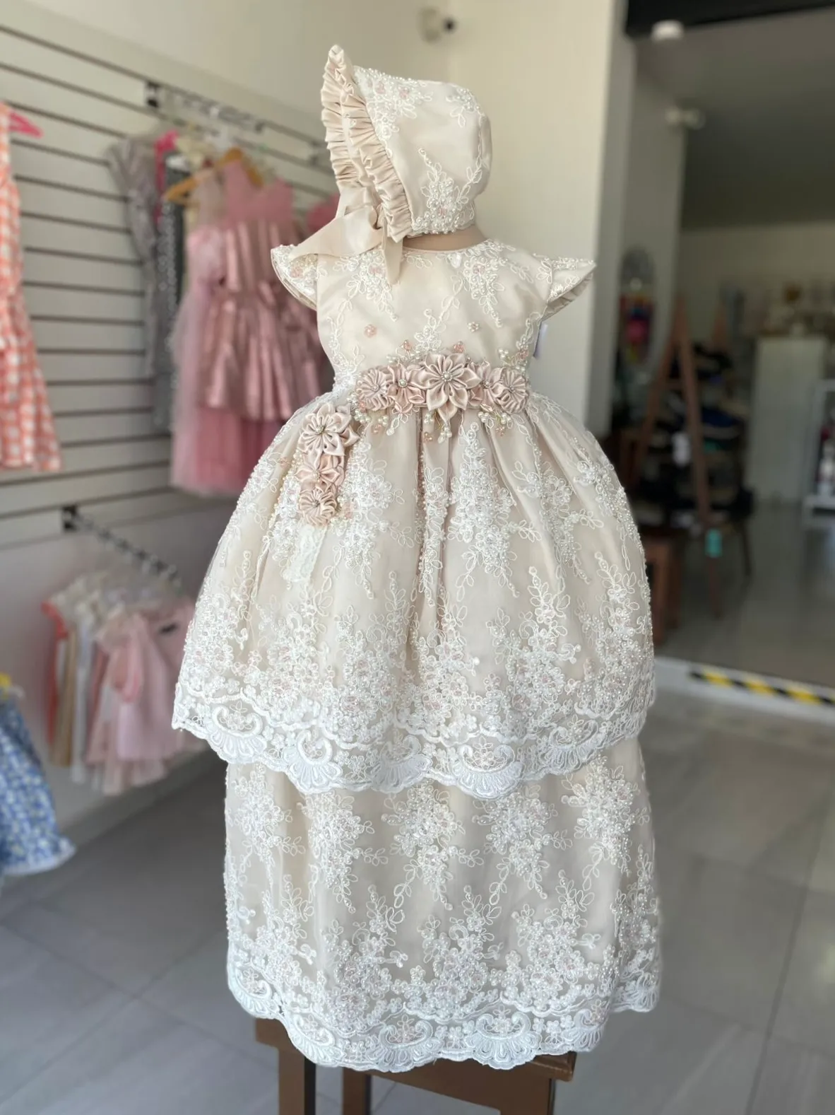 2001. De linea premium, ropon champagne con detalle de flores en palo de rosa