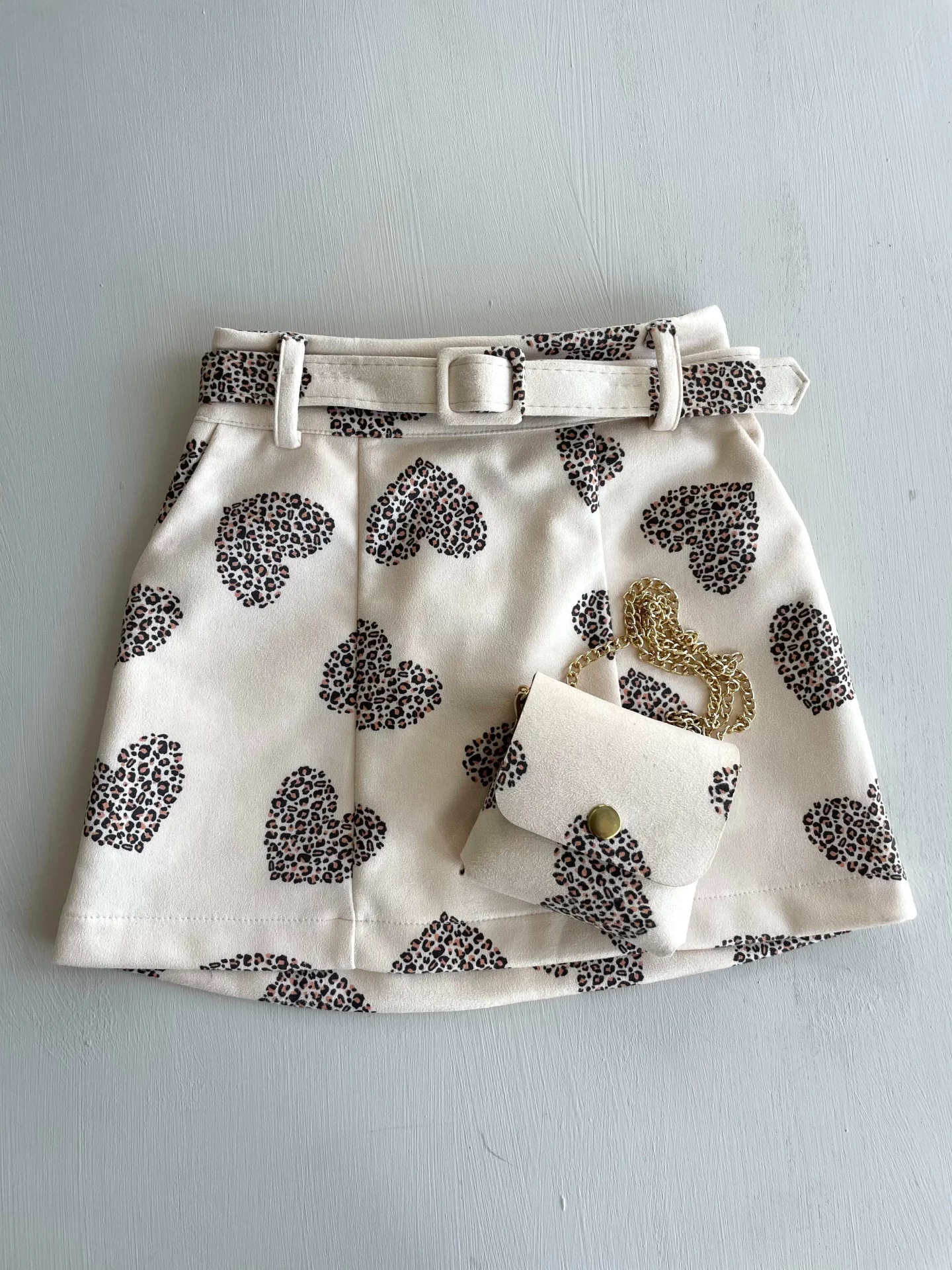 34222. Falda y bolsita de gamuza beige de corazones negros