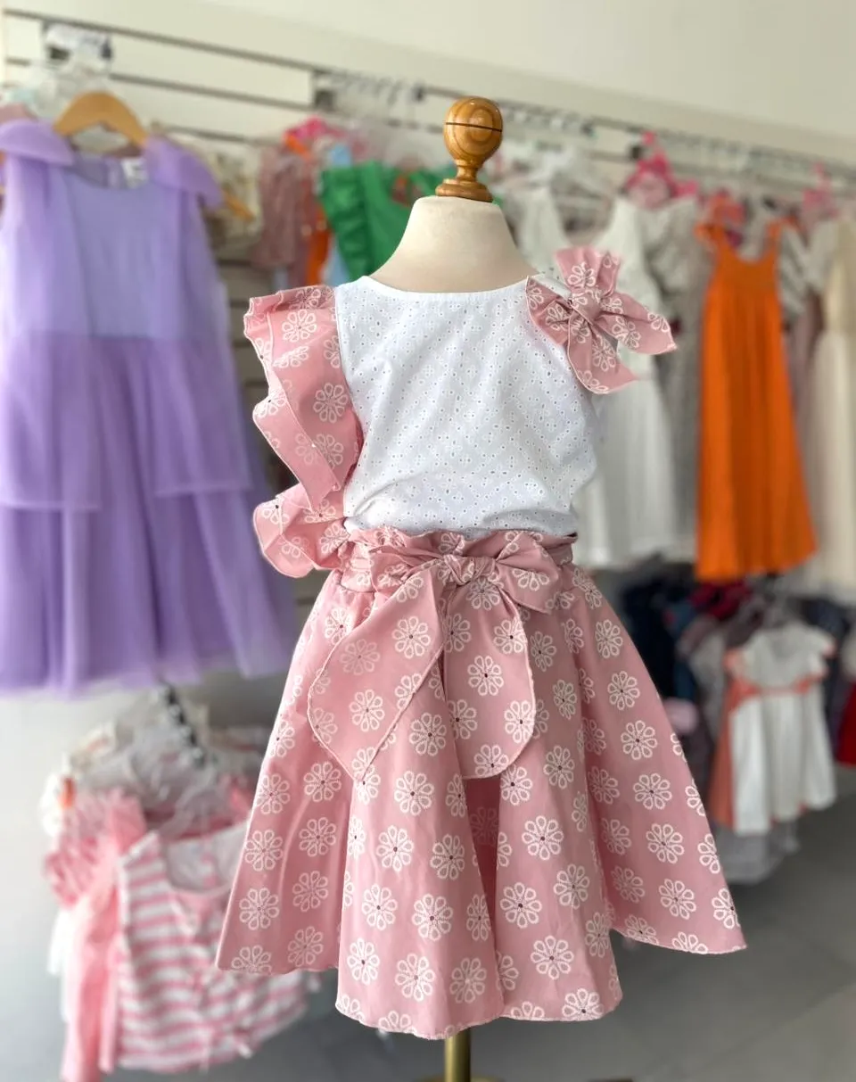34265. Conjunto de faldita rosa y blusa con detalle de olan y moño