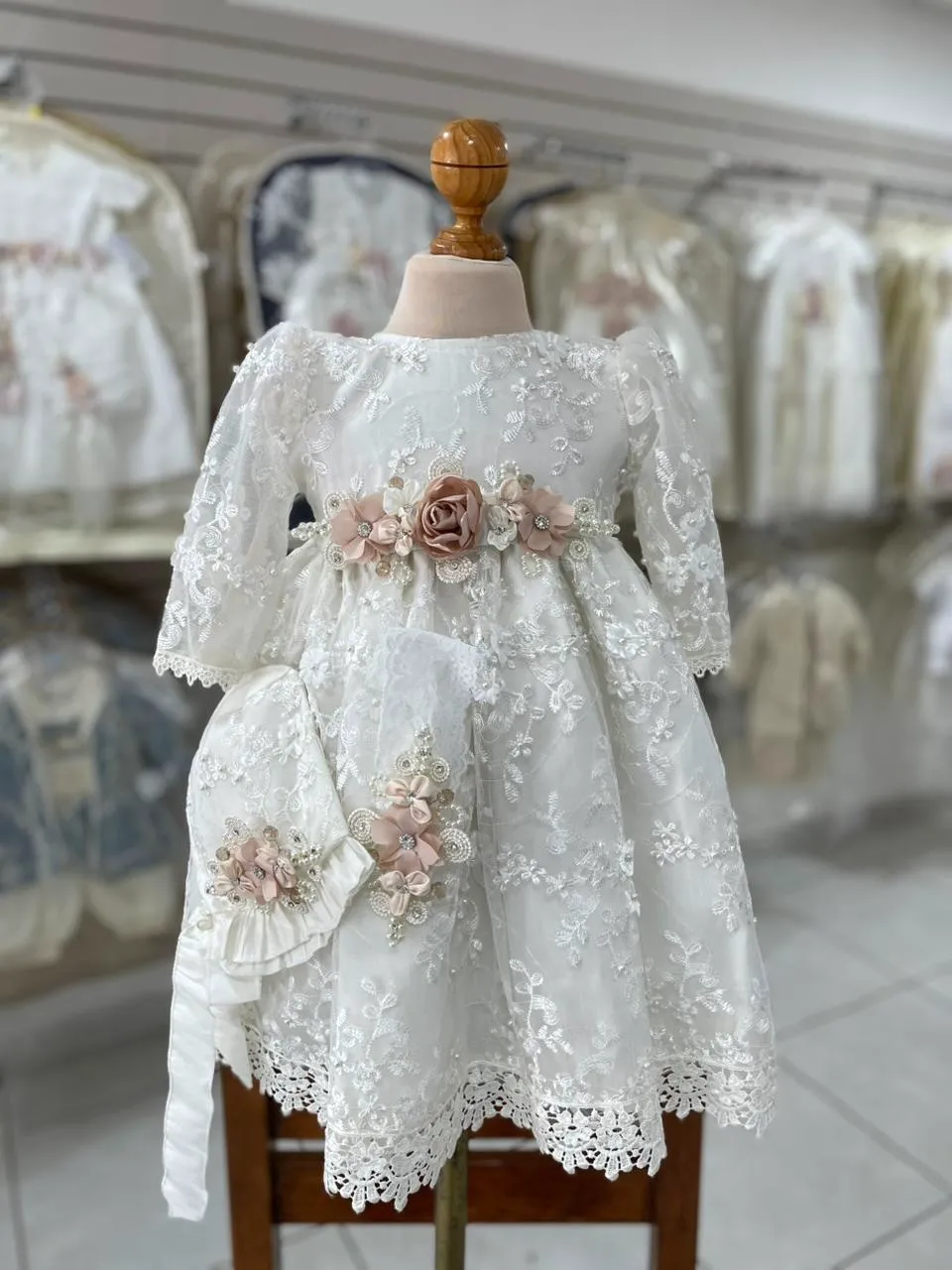 34283. Ropon ivory con manguita de encaje y detalles en palo de rosa