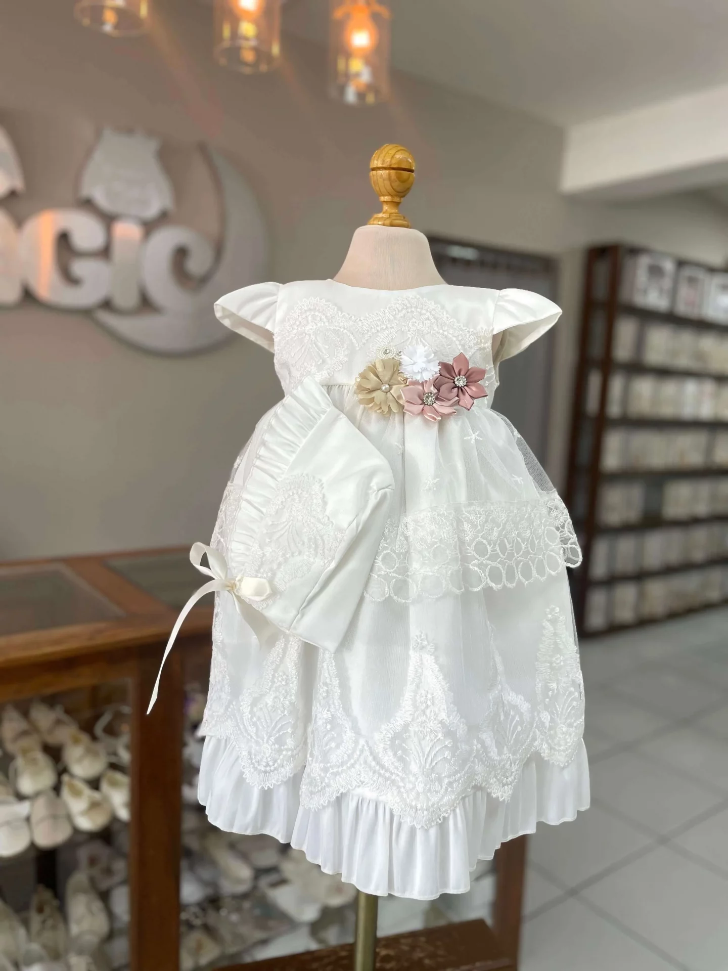 7217. Ropon largo con detalle de encaje y cuatro flores de lado