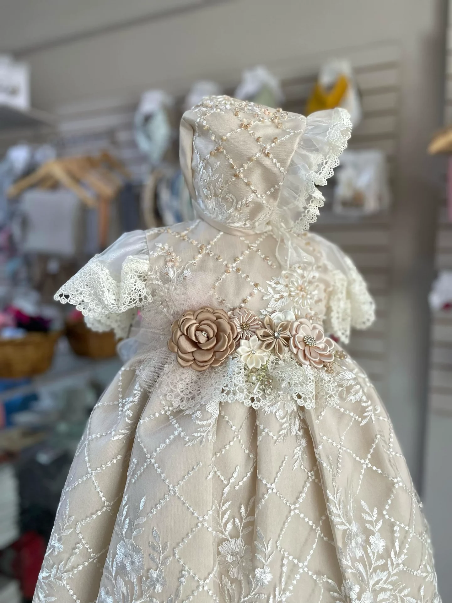 7291. Ropon desmontable en champagne con detalles de tul y flor