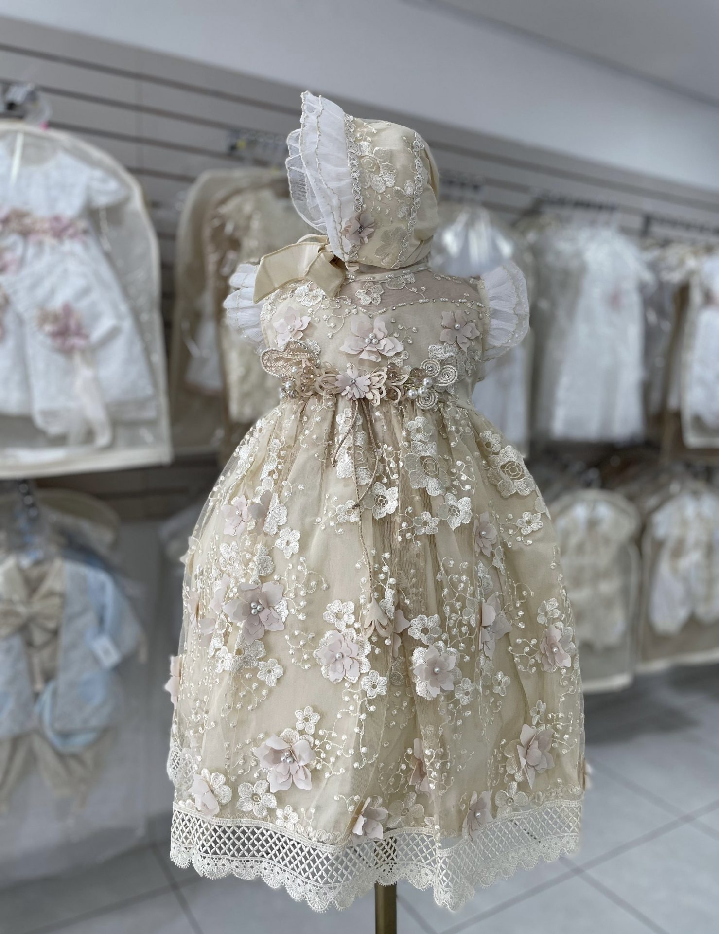 7332. Ropon champagne con detalle en manguitas y flor 3D