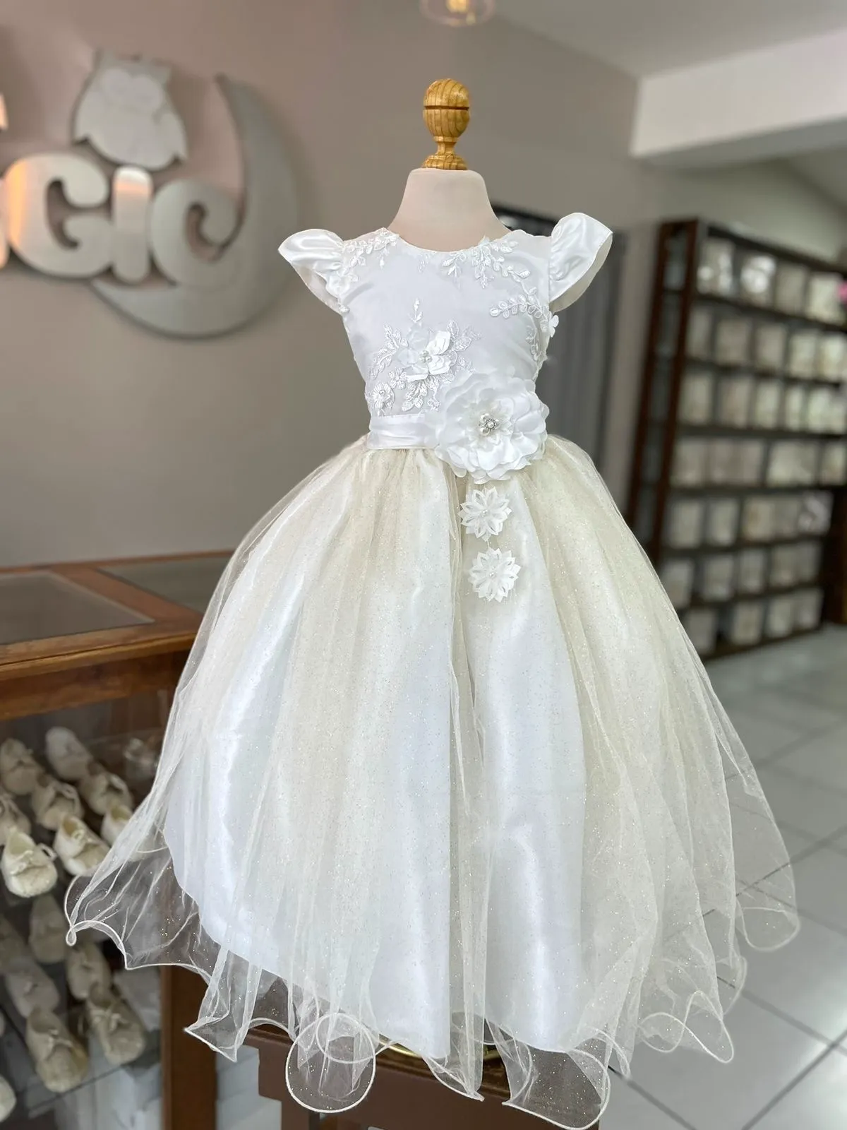 8134. Vestido blanco con detalle de tul y flor de lado